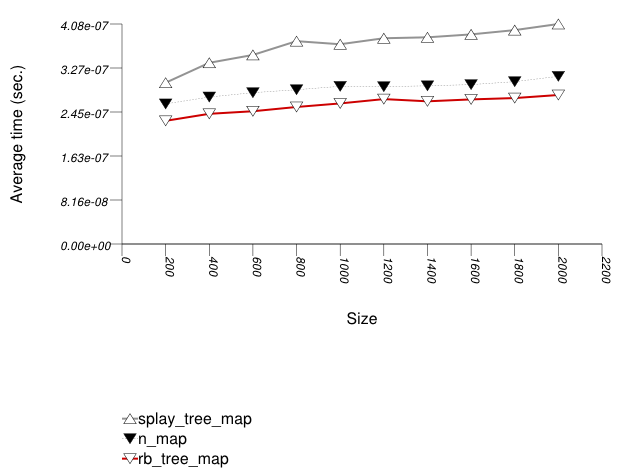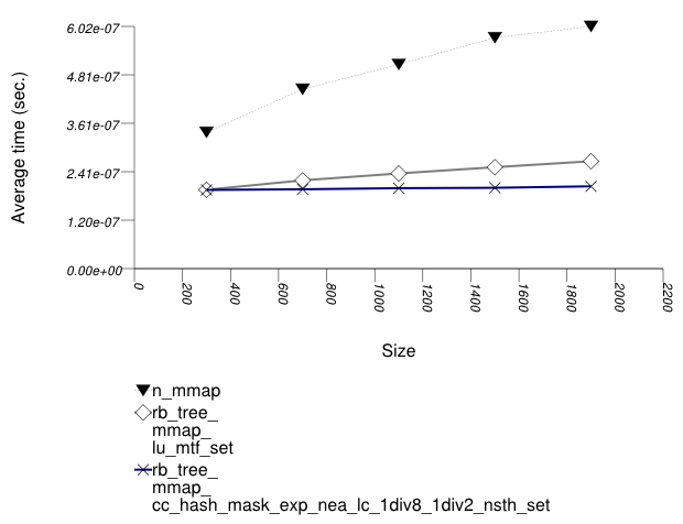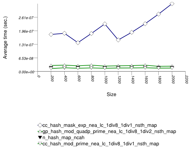 In this setting, the range-hashing scheme affects performance more than other policies. As the results show, containers using mod-based range-hashing (including the native hash-based container, which is currently hard-wired to this scheme) have lower performance than those using mask-based range-hashing. A modulo-based range-hashing scheme's main benefit is that it takes into account all hash-value bits. Standard string hash-functions are designed to create hash values that are nearly-uniform as is ([biblio.knuth98sorting]).